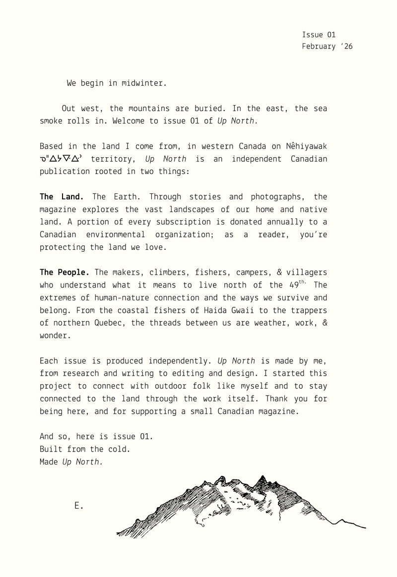 Inside Up North, you'll find stories & photographs from the land I come from on Nêhiyawak ᓀᐦᐃᔭᐍᐏᐣ territory. Our land from Haida Gwaii to St. John's and our people from the Inuit of Iqaluit to the Francophones of Quebec. Built from the cold. Made Up North.